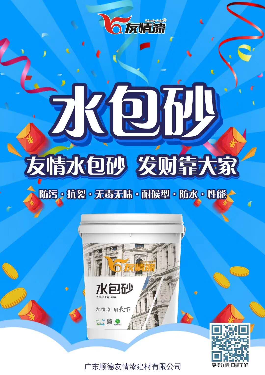 作為低碳環保漆品牌友情漆,始終堅持為用戶提供綠色環保、健康安全的外墻涂料產品,其生產的水包砂一直采用環保原材料來制造,確保用友情水包砂裝飾出來墻面,新穎美觀,堅固耐用,讓使用友情水包砂的廣大工程客戶,做強做大市場,實現彼此共贏,真正體現出友情水包砂,發財靠大家的意義,如有需要訂購友情水包砂的客戶,歡迎隨時聯系400-830-9383。