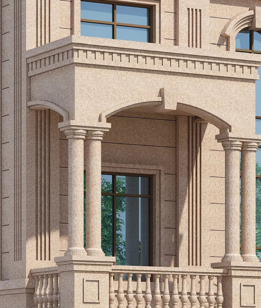 水包砂(荔枝面、火燒面):荔枝面、火燒面仿石既要有石材花紋的色相感,同時又要具備荔枝面、火燒面石材表面彩砂的質感。用手觸感也應該有原石的凹凸面,在粒子色彩方面必須相近,粒子色彩之間要柔和對接,遠看要混為相近色,近看要有粒子的柔和清晰度。