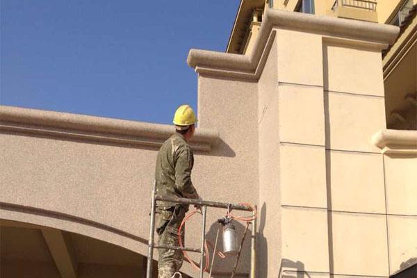 ⑤ 大面噴涂:在上道工藝完全干燥后方可噴涂水包水多彩涂料。嚴(yán)格控制足量噴涂,要求連續(xù)均勻噴涂,防止過(guò)量產(chǎn)生流掛,恰到好處一步到位可有利改善成型質(zhì)量,確保花樣穩(wěn)定、手感流暢、細(xì)膩光滑。